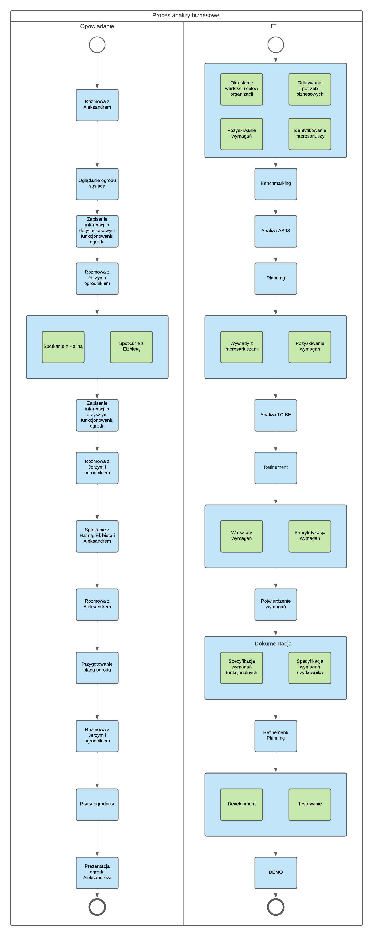 I na koniec mapowanie procesu – technika służąca uchwyceniu przebiegu procesów w postaci diagramów. Na diagramie powyżej opisałem dwa procesy – jeden z opowiadania, drugi ze świata IT, tak aby podsumować czynności wykonywane podczas analizy biznesowej.