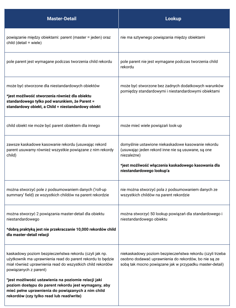 Ważnym aspektem wpływającym na efektywne testowanie jest rozumienie powiązań danych, które występują w Salesforce. Do najczęściej występujących typów danych możemy zaliczyć Master-Detail oraz Lookup.