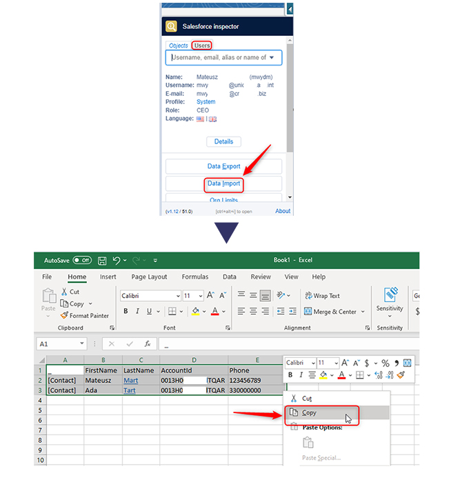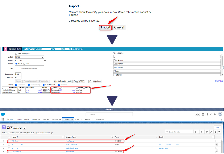 ?Podając dane z Excel do Salesforce trzeba wskazać kolumny, które są odpowiednikiem nazw pól wymaganych do stworzenia danego rekordu w obiekcie.