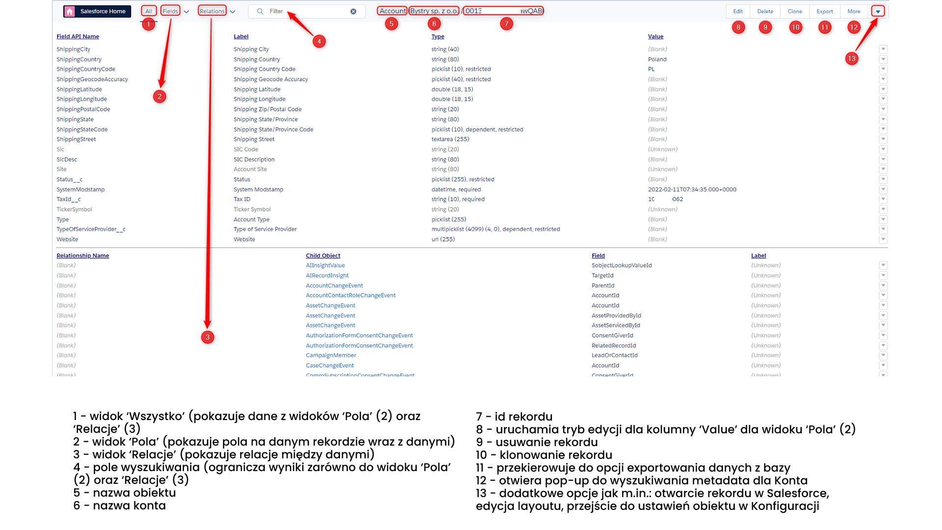 ?Wyświetlana liczba pól w Salesforce Inspectorze może różnić się w zależności od obiektu, z którego jest rekord. Zawsze widoczne są trzy pola: ‘Name’, ‘Label’ oraz ‘Id’.